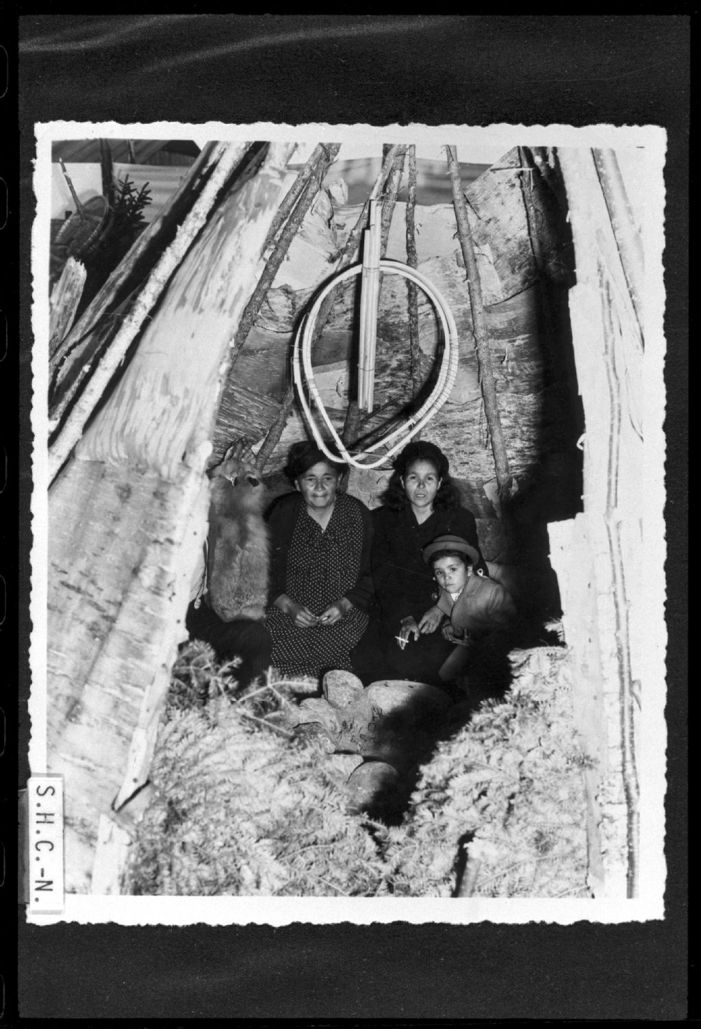 Indiennes dans une tente au centenaire de Betsiamites, Négatif reproduit en 1980 (original créé en 1949), Archives nationales à Sept-Îles, Fonds Société historique de la Côte-Nord inc., (09N,P8,S1,P451), Société historique de la Côte-Nord.