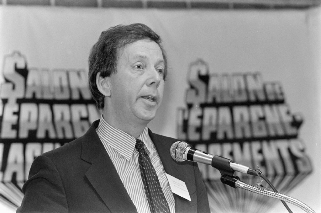 André Vallerand, ministre délégué à la P.M.E. visite le Salon de l'épargne placement, Montréal