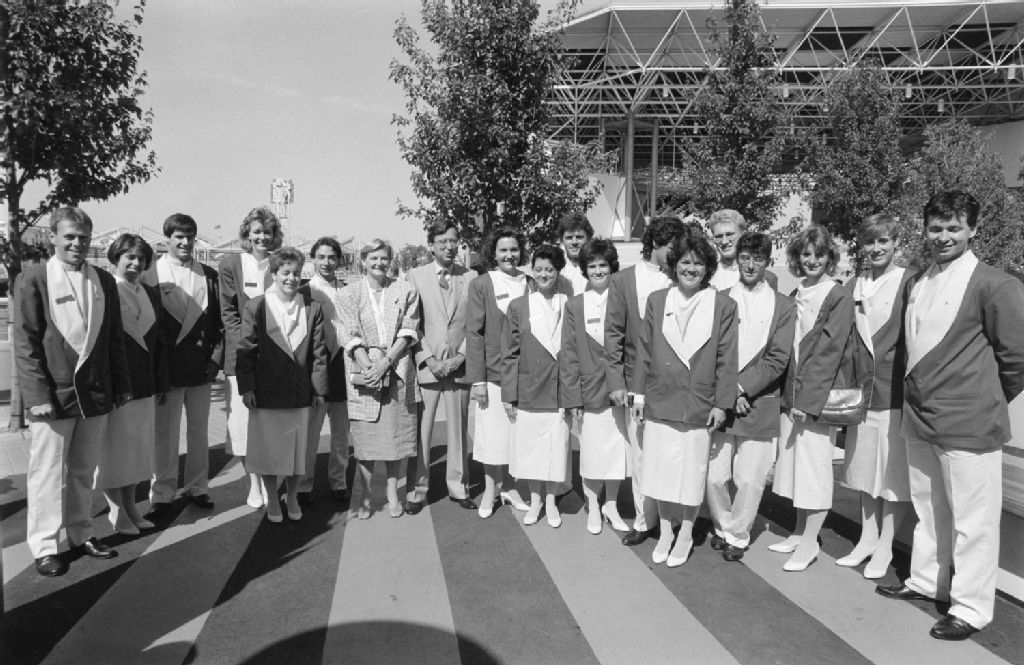 - A1 à 5 : Préposés à l'accueil du Pavillon du Québec avec M. et Mme Robert BourassaA6 - C - D - E : Marc-Yvan Côté, Gil Rémillard, Robert Bourassa, Claude Benjamin et Richard French devant de Pavillon du Québec