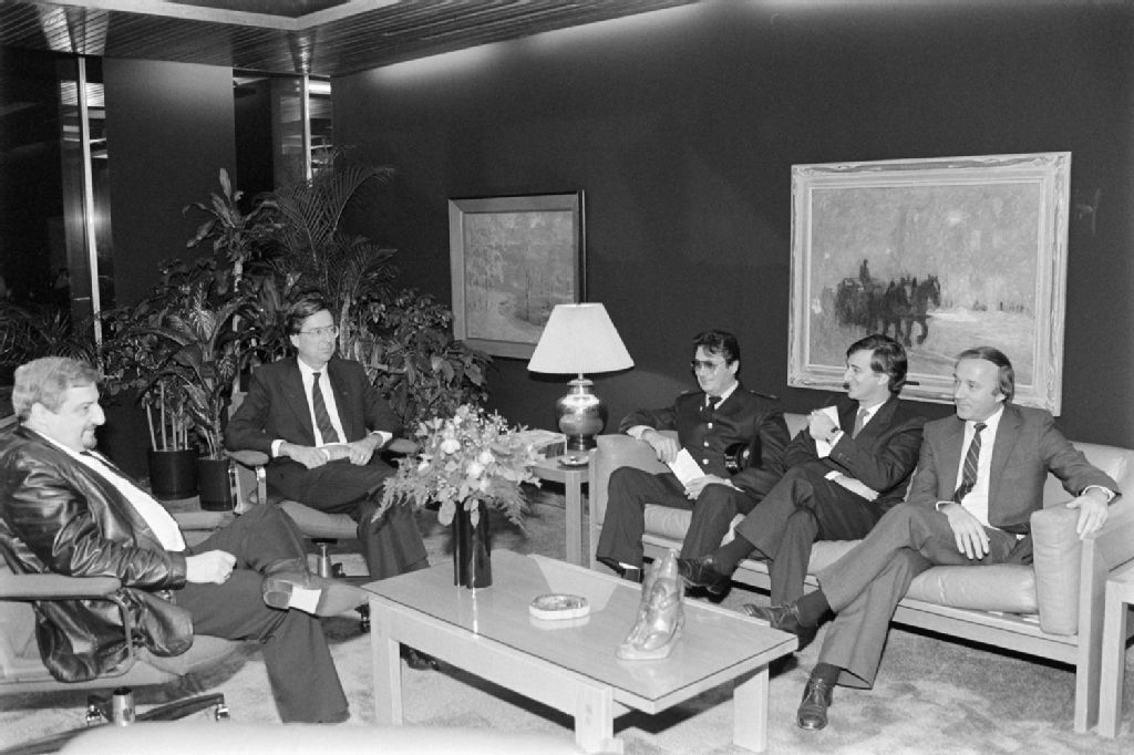 Robert Bourassa rencontre le Dr. Alphonse Roy, directeur de l'Institut des grands brûlés et Raymond Chevalier, directeur du Service des incendies, 23 octobre 1986, Archives nationales à Québec, Fonds Ministère des Communications, (03Q,E10,S44,SS1,D86-508), Marc Lajoie.