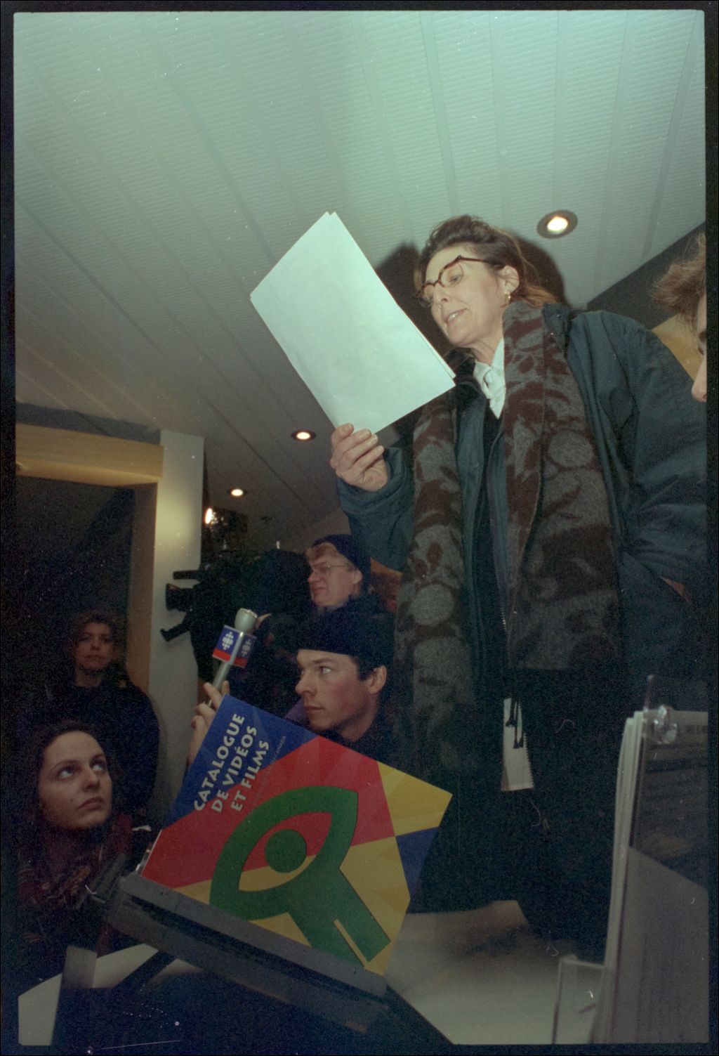 Conférence de presse de cinéastes suite aux coupures à l'Office national du film (ONF), 6 avril 1994, Archives nationales à Montréal, Fonds Le Devoir, (06M,P10009,S10,SS1,D707), Jacques Grenier.