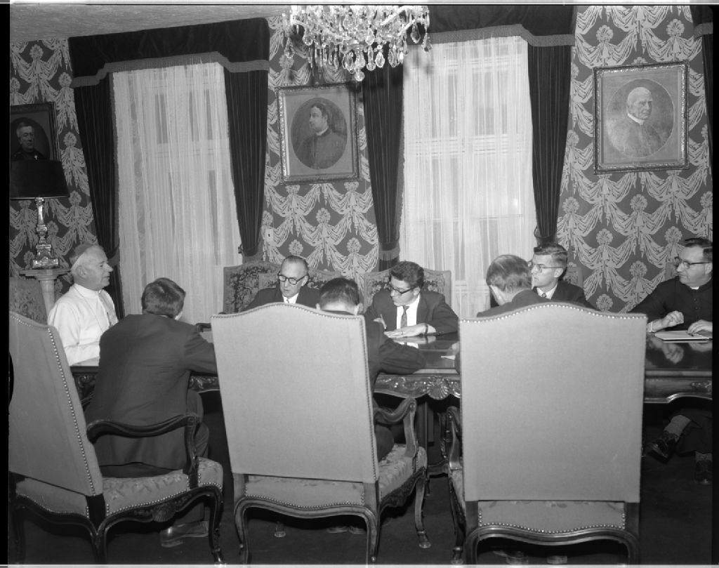 Monseigneur Joseph-Marie Lemieux donne une conférence de presse, 12 décembre 1962, Archives nationales à Gatineau, Fonds Champlain Marcil, (07H,P174,S1,D28994), Attribuée à Champlain Marcil.