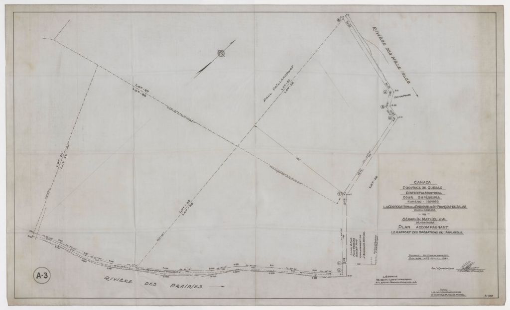 Canada Province de Québec District de Montréal Cour Supérieure numéro - 189083 la Corporation de la paroisse de St-François-de-Sales demanderesse - vs - Séraphin Mathieu et al défendeurs Plan accompagnant le rapport des opérations de l'arpenteur