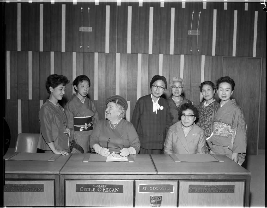 Mme Cécile O'Regan, conseillère municipale, reçoit un groupe de Japonais, 16 octobre 1962, Archives nationales à Gatineau, Fonds Champlain Marcil, (07H,P174,S1,D28536), Attribuée à Champlain Marcil.