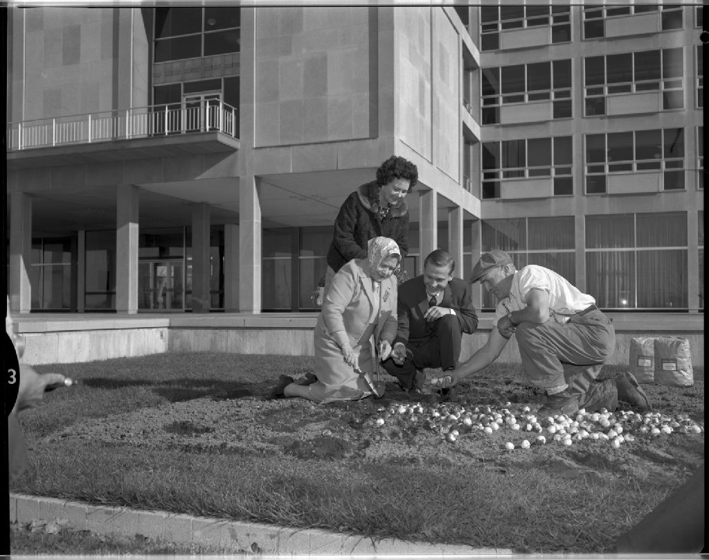 La mairesse Charlotte Whitton plante des tulipes en face de l'hôtel de ville d'Ottawa, 19 octobre 1962, Archives nationales à Gatineau, Fonds Champlain Marcil, (07H,P174,S1,D28554), Attribuée à Champlain Marcil.