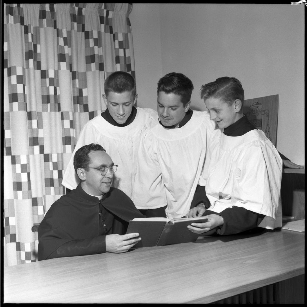 Trois enfants de choeur avec le curé de la paroisse Sainte-Rose-de-Lima de Gatineau