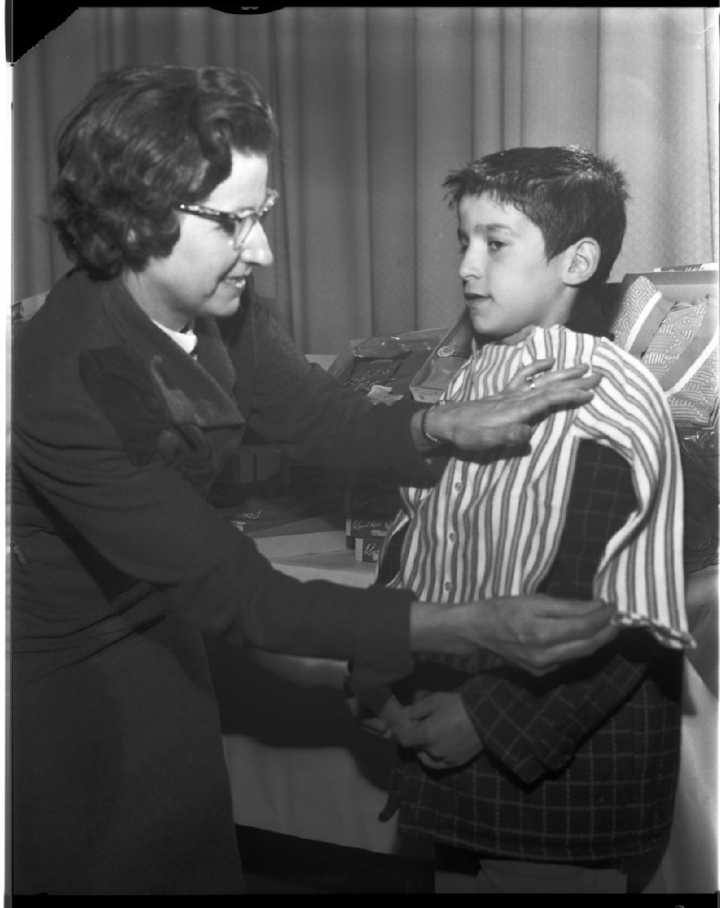 Distribution de chandails par les Rotary Anns au Cinéma Laurier de Hull, 10 novembre 1962, Archives nationales à Gatineau, Fonds Champlain Marcil, (07H,P174,S1,D28713), Attribuée à Champlain Marcil.