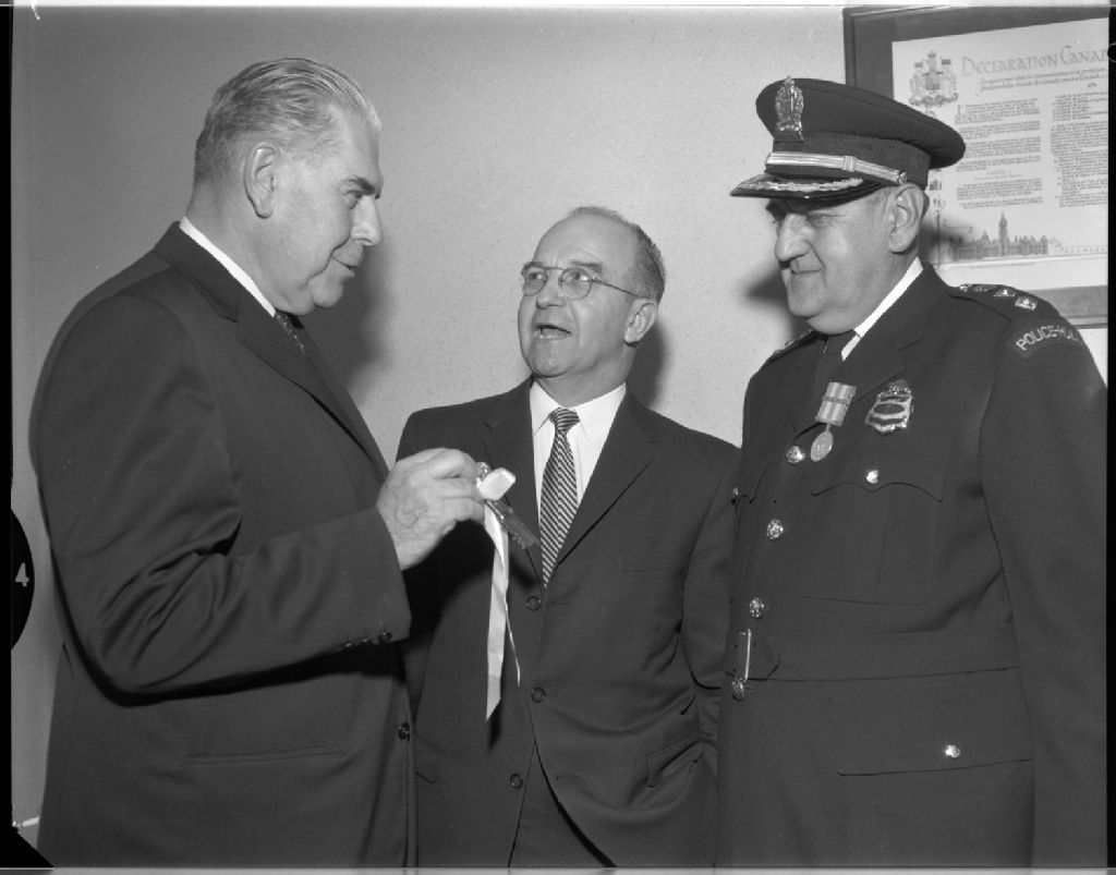 Monseigneur Adéodat Chaloux, J. A. Robert et Maxime Lavigne, 11 novembre 1962, Archives nationales à Gatineau, Fonds Champlain Marcil, (07H,P174,S1,D28729), Attribuée à Champlain Marcil.