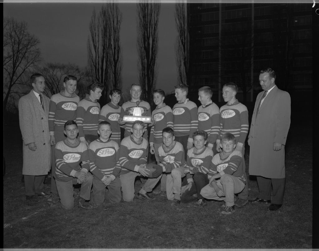 Touch football entre l'école Guigues et l'école Saint-Paul d'Ottawa, 12 novembre 1962, Archives nationales à Gatineau, Fonds Champlain Marcil, (07H,P174,S1,D28735), Attribuée à Champlain Marcil.