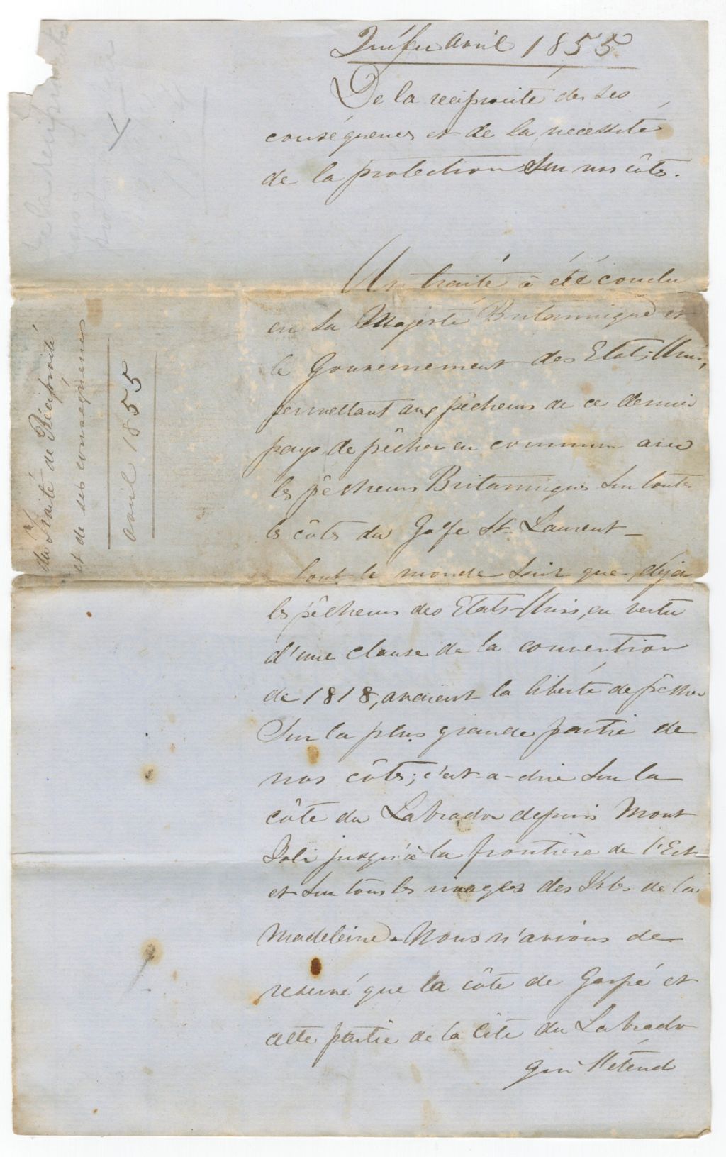 Lettre de Pierre-Étienne Fortin à Pierre-Joseph-Olivier Chauveau, secrétaire provincial. Il mentionne entre autres que le traité de réciprocité entre Sa Majesté Britannique et le gouvernement des États-Unis n'occasionne pas de sacrifice de la part des pêcheurs puisque les pêcheurs des États-Unis étaient déjà bien présents grâce à une clause de la convention de 1818, qu'il lui donne espoir d'un bon commerce et qu'il faut une surveillance sur les eaux plus que jamais pour éviter la dépravation des pêcheurs étrangers sur le territoire canadien. Pierre-Étienne Fortin mentionne aussi que les côtes du Nouveau-Brunswick, de la Nouvelle-Écosse et de l'Île-du-Prince-Édouard ne voient pas de pêcheurs américains puisqu'elles sont réservées aux pêcheurs britanniques. Il lui évoque aussi plusieurs suppositions pour la prochaine saison. Le Traité de réciprocité a été signé le 6 juin 1854.