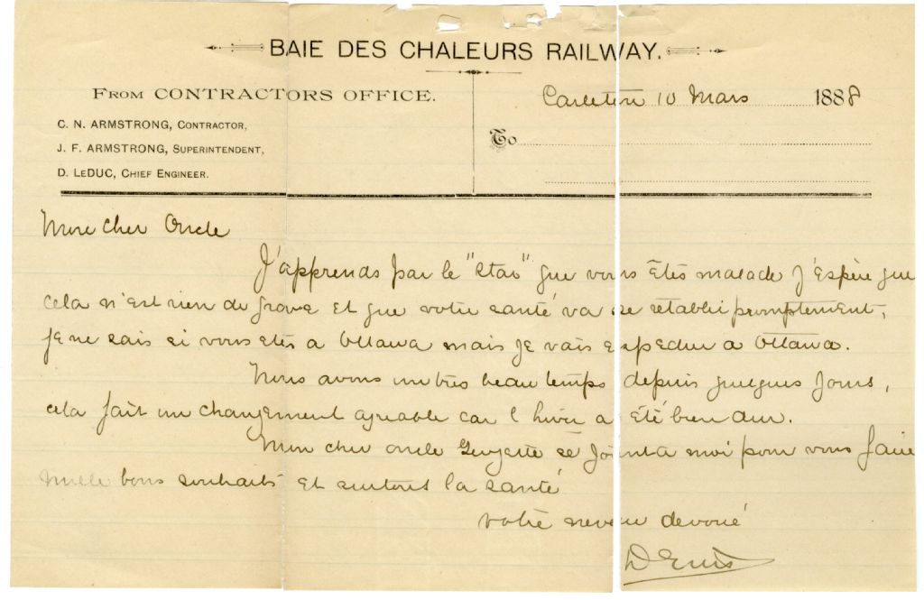 Télégramme du neveu de Pierre-Étienne Fortin envoyé par la Baie-des-Chaleurs Railway de Carleton à son oncle. Il epère que la santé de son oncle est bonne puisque la famille a appris par le journal Star qu'il était malade.