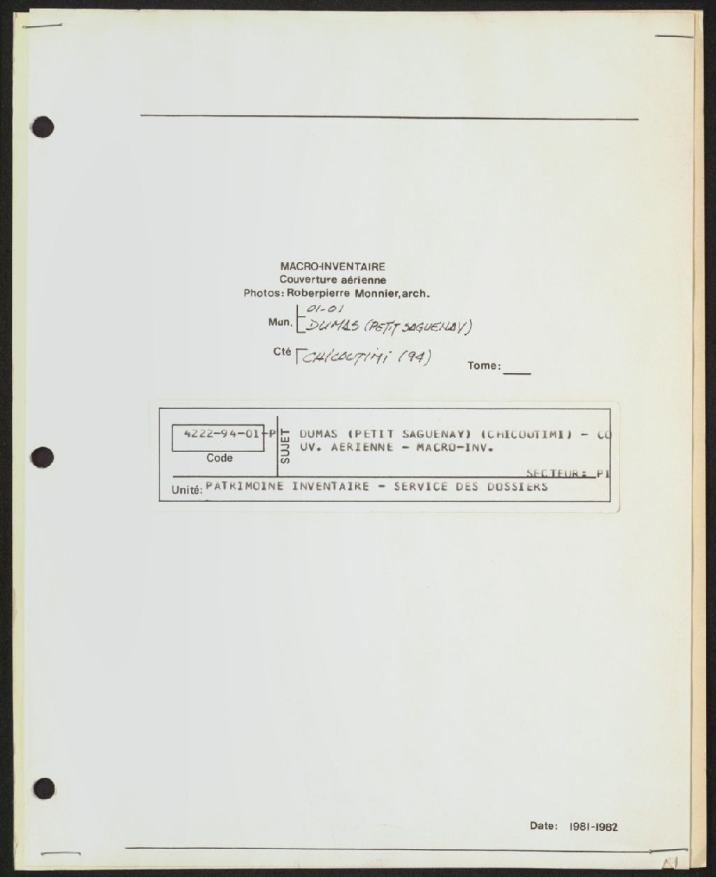 Dumas, 1982, Archives nationales à Québec, Fonds Ministère de la Culture et des Communications, (03Q,E6,S8,SS2,SSS14,D2,P5).