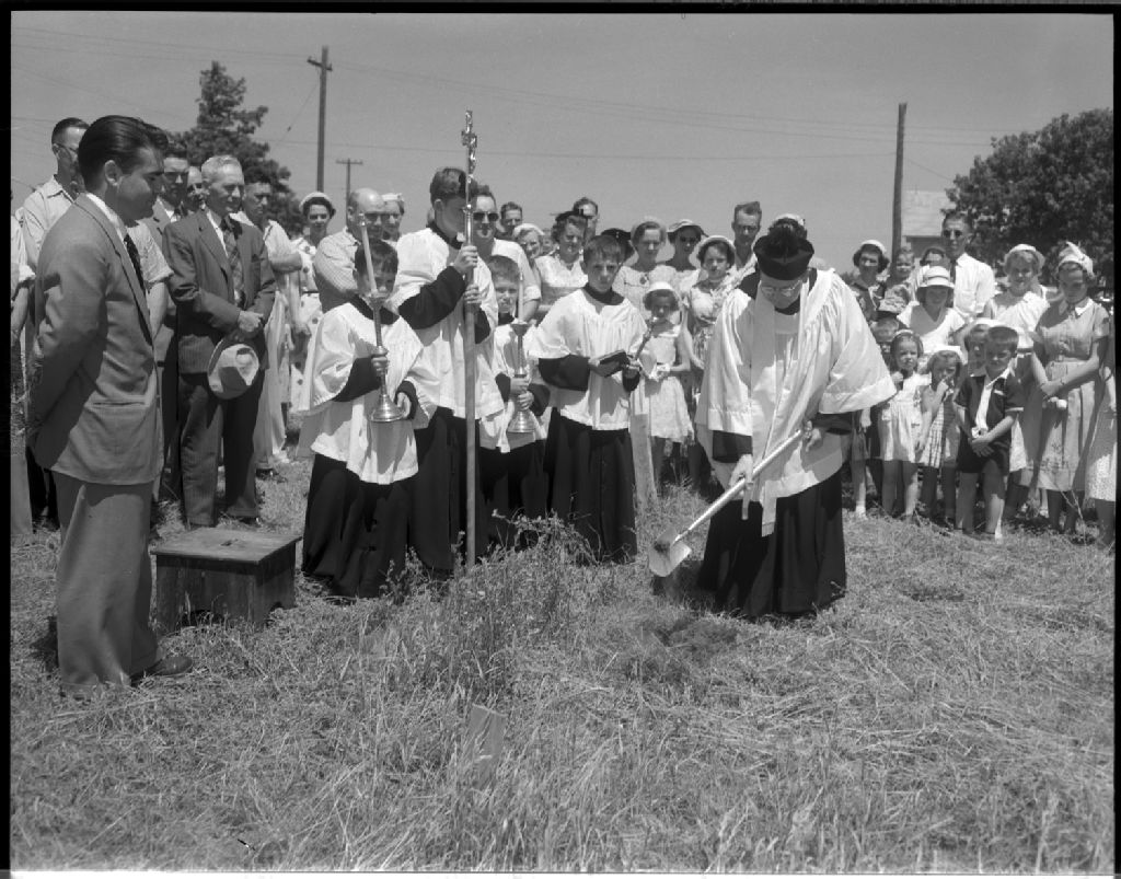 Première pelletée de terre de l'église de Saint-Augustin, 11 juillet 1955, Archives nationales à Gatineau, Fonds Champlain Marcil, (07H,P174,S1,D6010), Attribuée à Champlain Marcil.