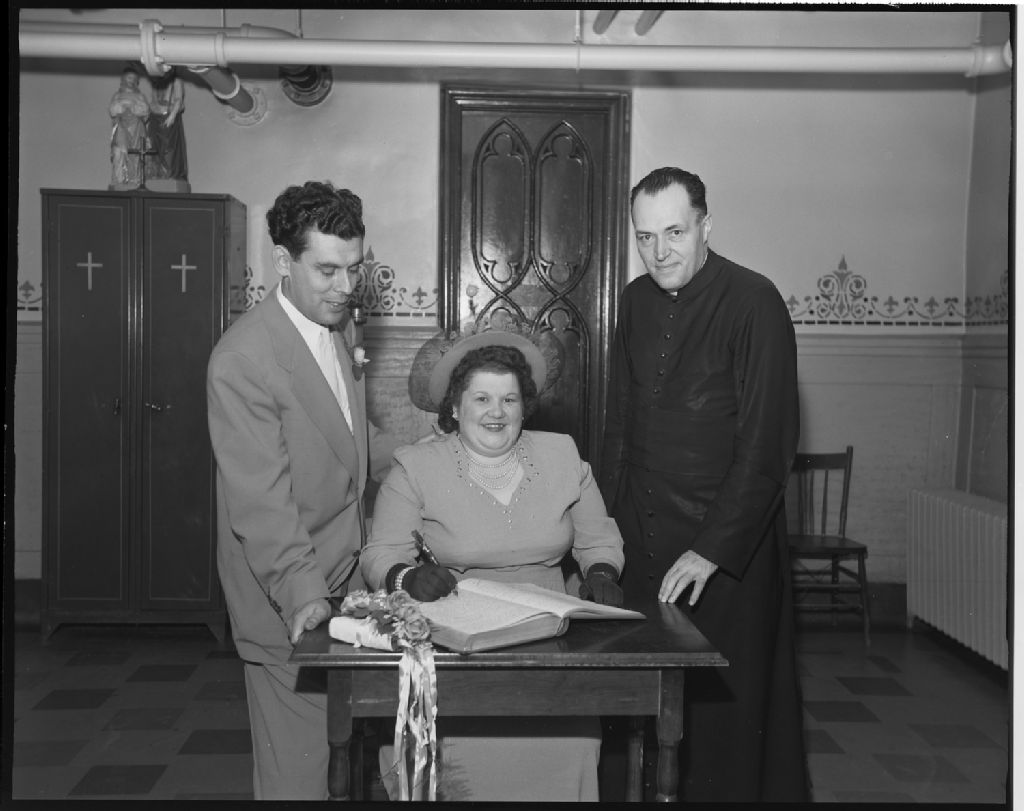 Mariage de Jeannette Chénier et de Ferrier St-Denis à la Cathédrale Notre-Dame d'Ottawa, 5 août 1950, Archives nationales à Gatineau, Fonds Champlain Marcil, (07H,P174,S1,D739), Attribuée à Champlain Marcil.