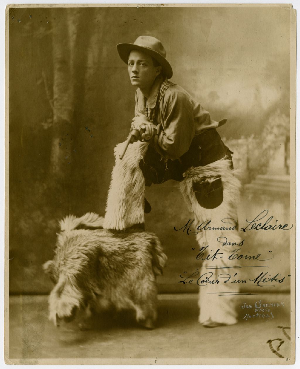 Ce dossier contient une photographie d'Armand Leclaire dans le rôle de Tit-Toine tirée de la pièce "Le coeur d'un Métis"