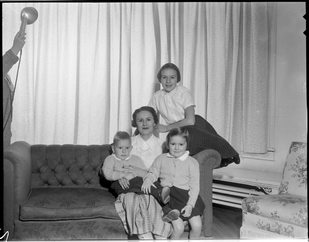 Mme Jean Chapdelaine et ses enfants, 15 novembre 1955, Archives nationales à Gatineau, Fonds Champlain Marcil, (07H,P174,S1,D6849), Attribuée à Champlain Marcil.