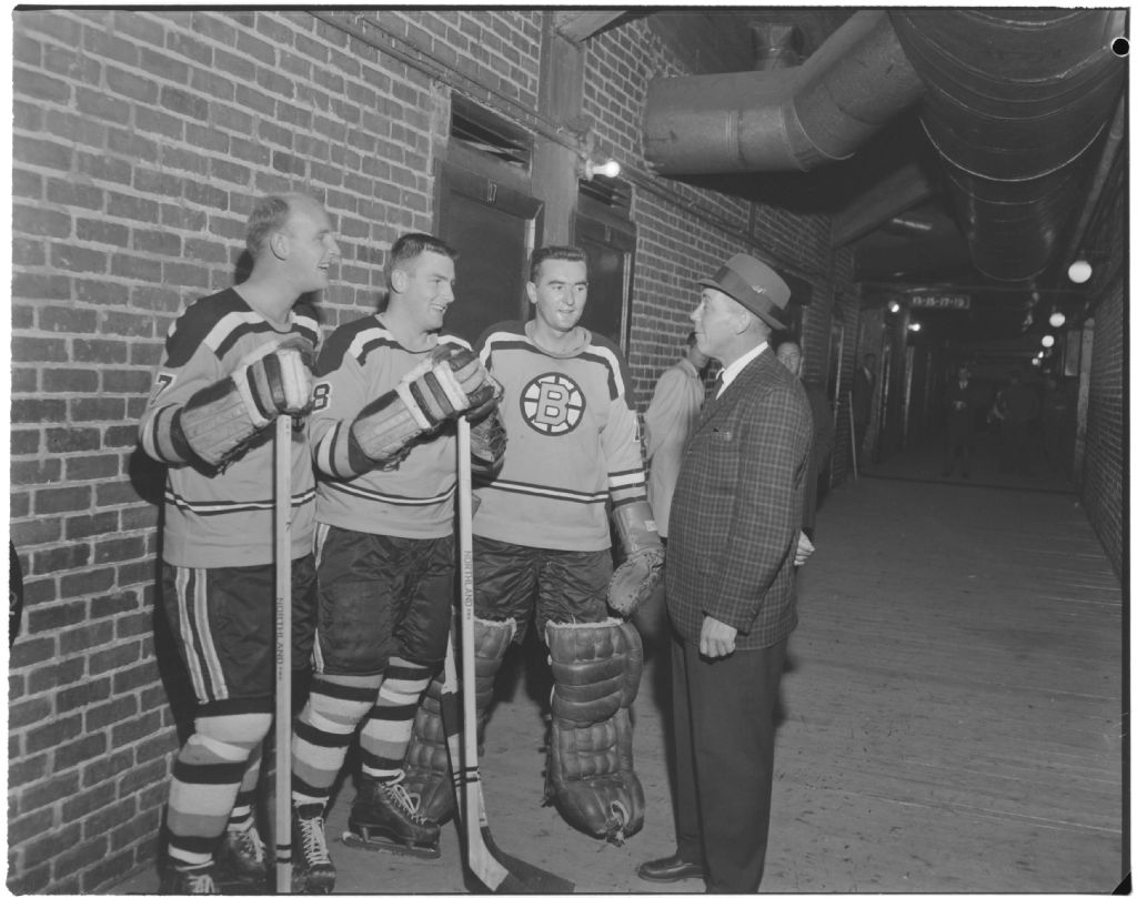 Trois joueurs de hockey de l'équipe des Bruins de Boston, 24 septembre 1962, Archives nationales à Gatineau, Fonds Champlain Marcil, (07H,P174,S1,D28319), Attribuée à Champlain Marcil.