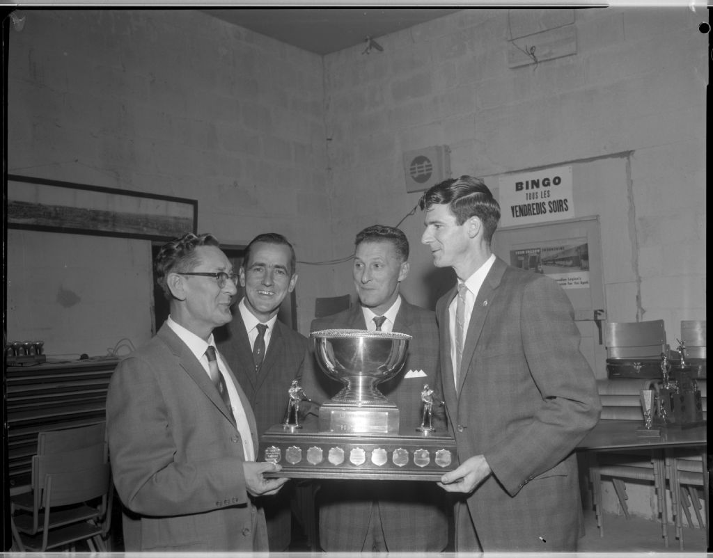 Remise de trophées aux champions de la ligue commerciale de balle molle de Pointe-Gatineau, 29 septembre 1962, Archives nationales à Gatineau, Fonds Champlain Marcil, (07H,P174,S1,D28387), Attribuée à Champlain Marcil.