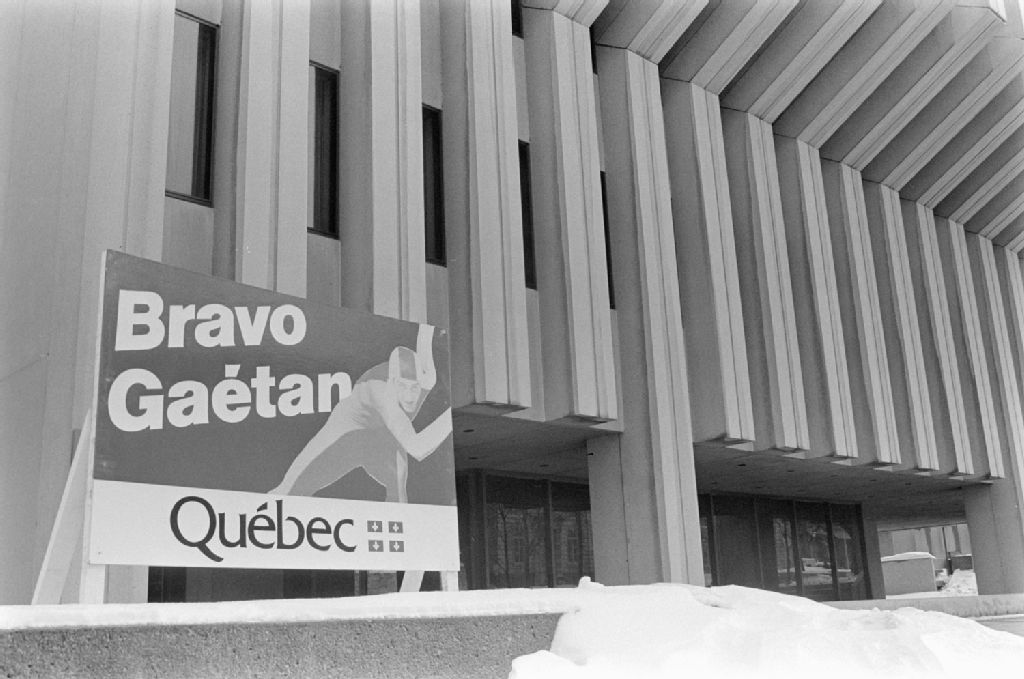 Affichage pour la journée Gaétan Boucher et Le premier ministre René Lévesque rencontre les délégués du Québec à l'étranger., 20 mars 1984, Archives nationales à Québec, Fonds Ministère des Communications, (03Q,E10,S44,SS1,D84-152), Marc Lajoie.