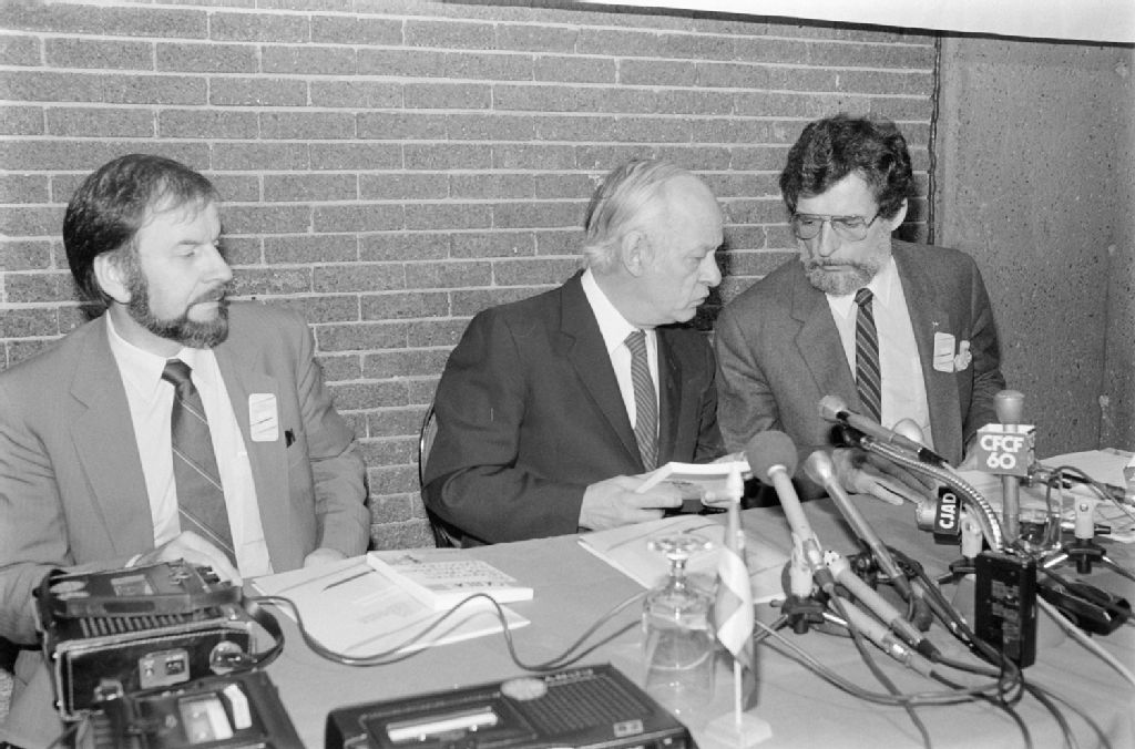 Le premier ministre René Lévesque et le ministre de l'Industrie , du Commerce et du Tourisme, Monsieur Rodrigue Biron, lors d'une conférence de presse à l'occasion de la semaine sur l'industrie, 15 mai 1984, Archives nationales à Québec, Fonds Ministère des Communications, (03Q,E10,S44,SS1,D84-283), Marc Lajoie.