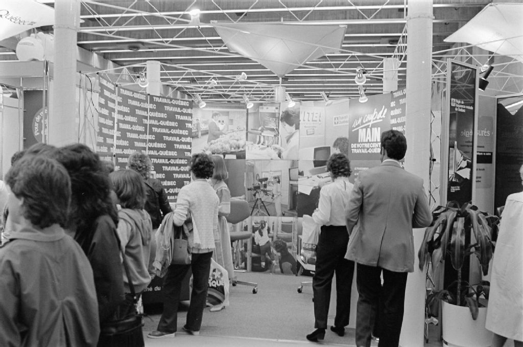 Kiosques au Salon de la femme de Montréal, mai 1984, Archives nationales à Québec, Fonds Ministère des Communications, (03Q,E10,S44,SS1,D84-306), Jean Bernier.