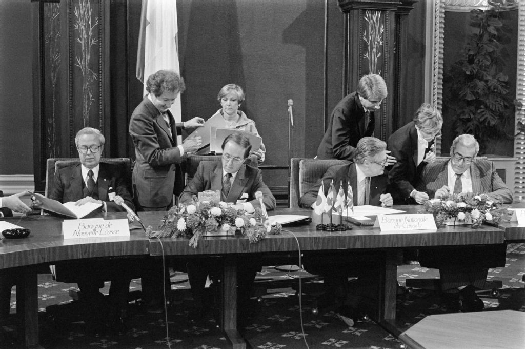 Lors de la signature d'un emprunt bancaire avec le ministre des finances, Monsieur Yves Duhaime, au Salon Rouge de l'Assemblée Nationale