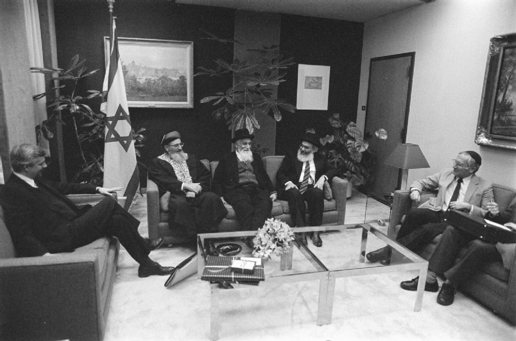 Le Grand Rabin d'Israel, Richon Letsion Rabbi Mordehki Eliyahou, rencontre Monsieur Pierre-Marc Johnson, ministre de la Justice, 19 décembre 1984, Archives nationales à Québec, Fonds Ministère des Communications, (03Q,E10,S44,SS1,D84-943), Bernard Vallée.