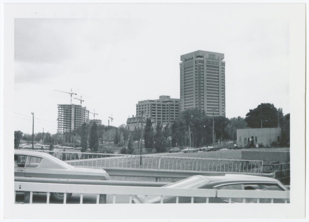 Gratte-ciel et condos vus de la route, [Entre 1969 et 1974], Archives nationales à Gatineau, Fonds Roger Poirier, (07H,P134,S6,SS1,D2,P9), Photographe non identifié.