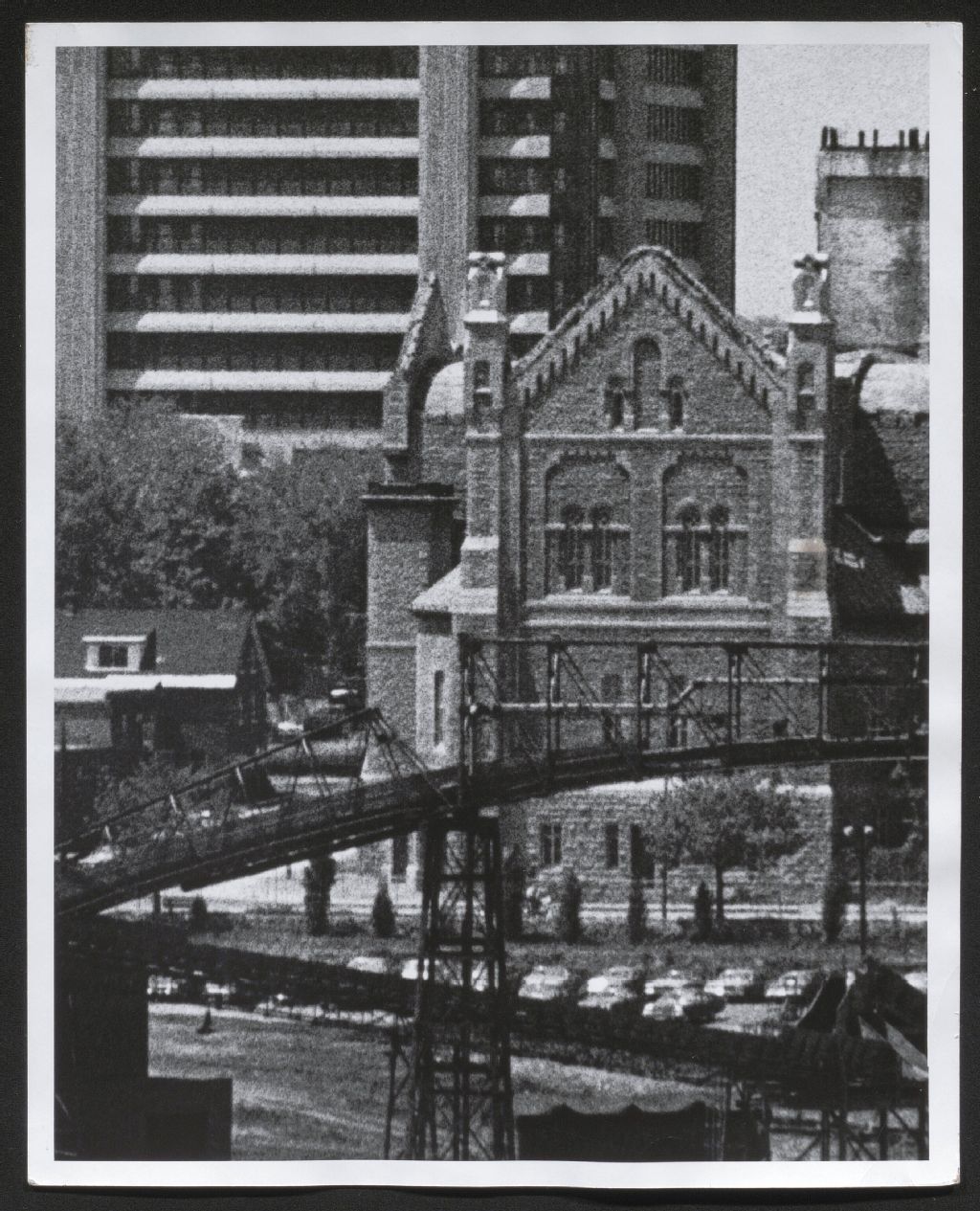 Photographie de l'arrière de l'église Notre-Dame-de-Grâce en 1972. À l'avant-plan, la structure de la papetière E.B. Eddy qui servait à transporter les billes de bois pour ensuite les empiler. À l'arrière-plan, le complexe de Place du Portage.