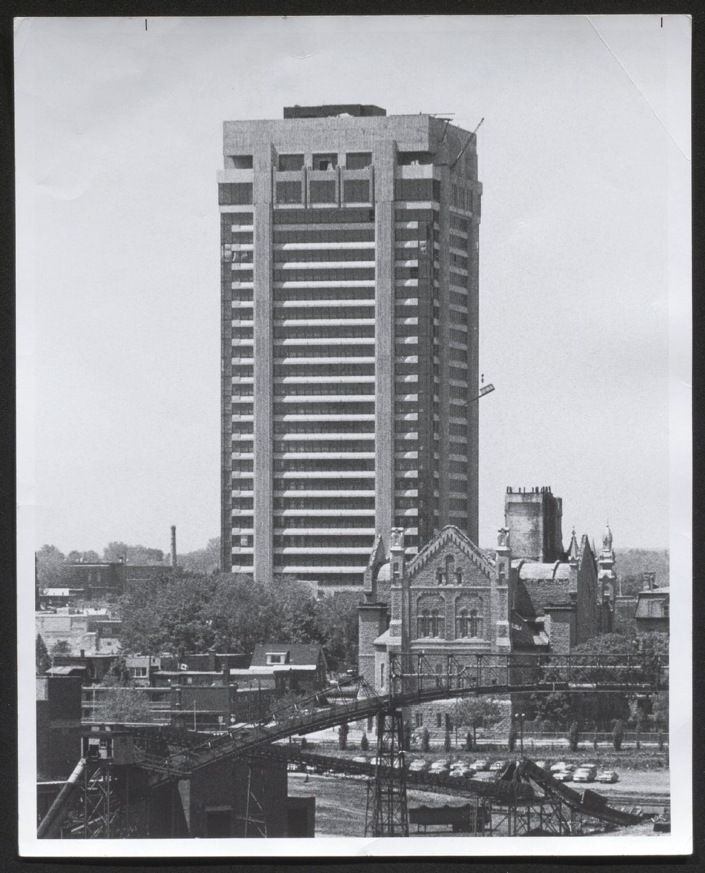 - Vue d'ensemble de l'Église Notre-Dame-de-Grâce ainsi que la phase I du complexe de la Place du Portage en 1972. Au premier plan, la structure métallique du système de transport des billes de bois de la E.B. Eddy.