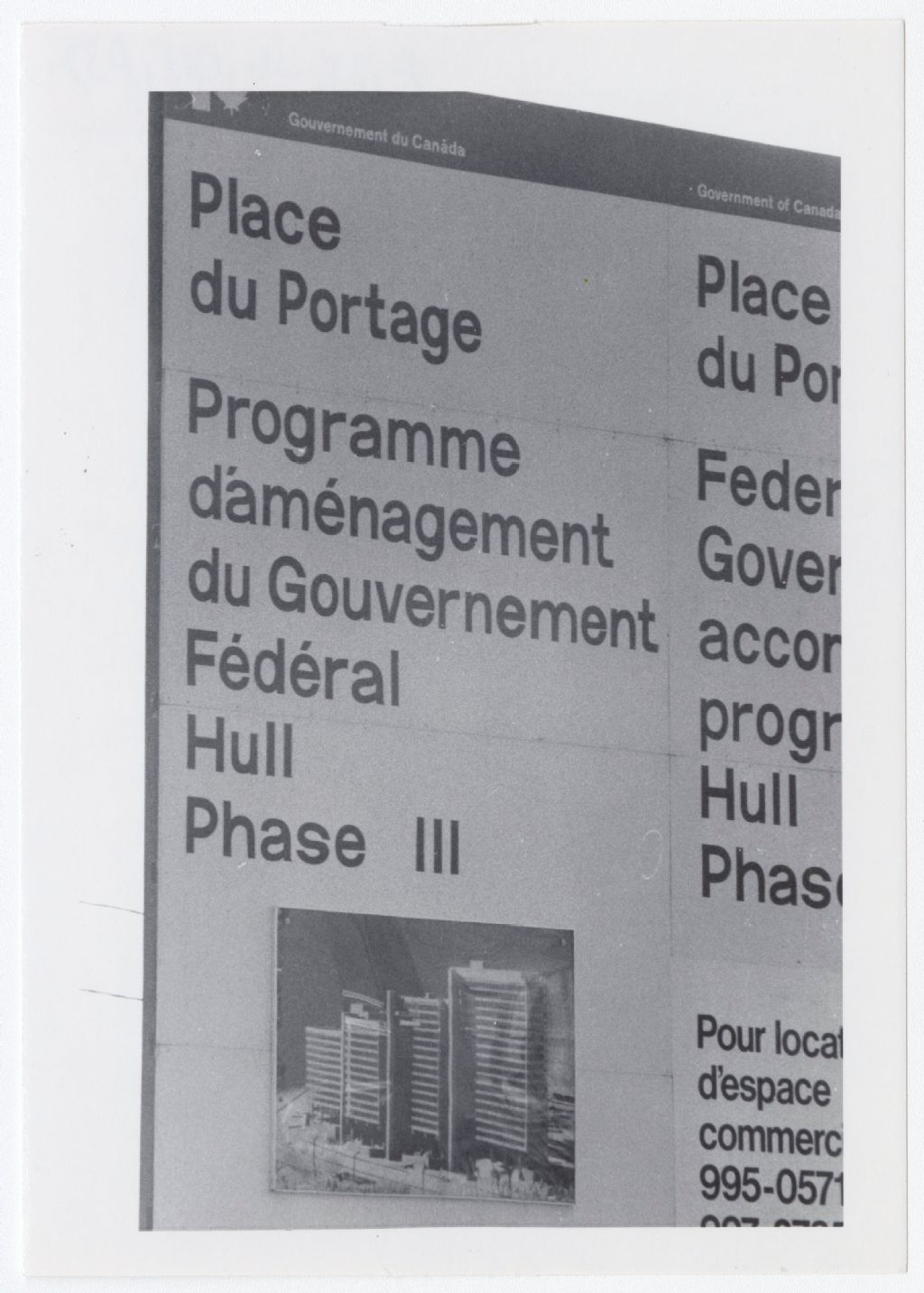 Photographie d'un panneau d'affichage comprenant les informations suivantes :« Place du Portage Programme d'aménagement du Gouvernement Fédéral Hull Phase III » On peut voir que le texte est également inscrit en anglais et qu'il y aussi les coordonnées de location (Informations coupées par la photographie).