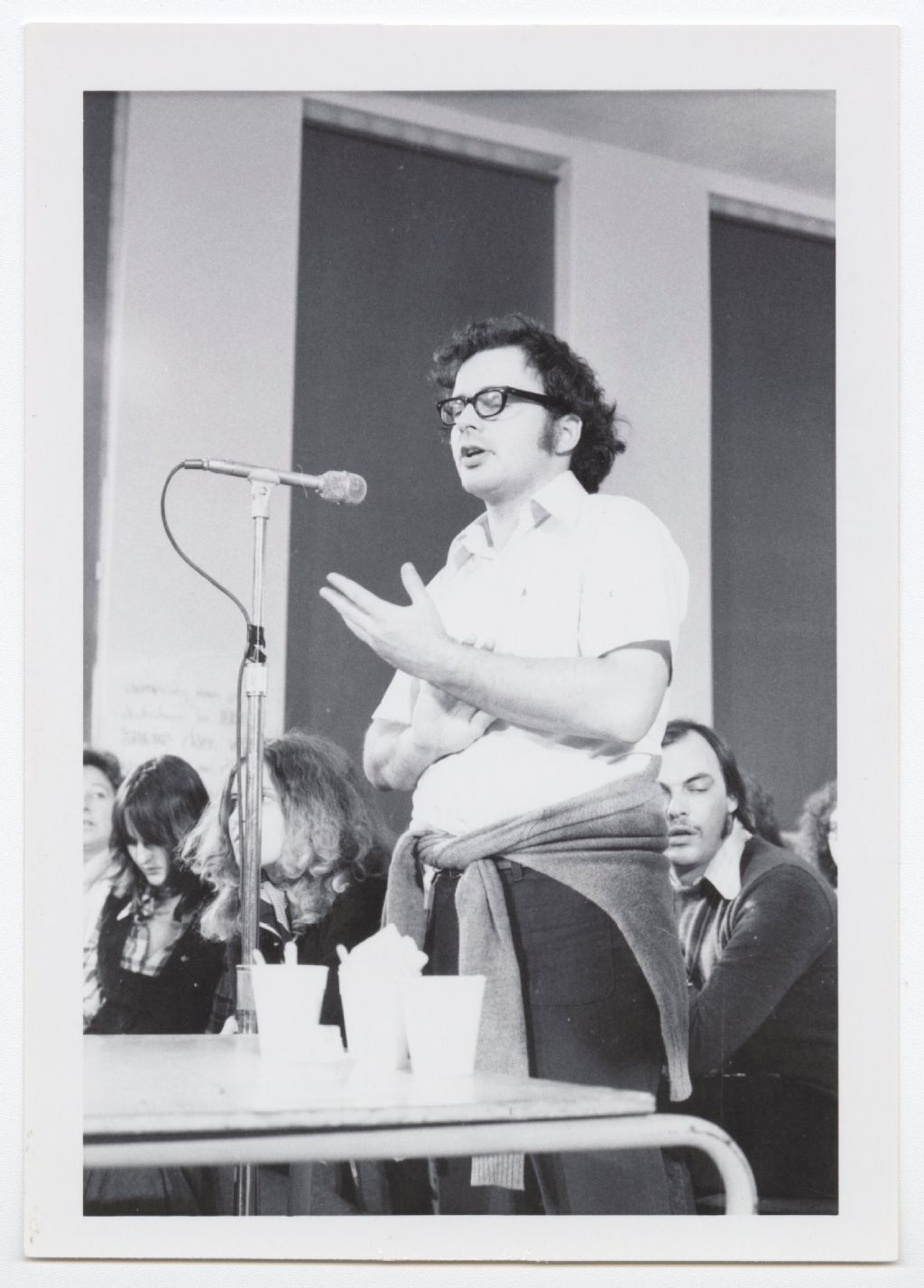 Marc Bonhomme - prise de parole, [1969-1975], Archives nationales à Gatineau, Fonds Roger Poirier, (07H,P134,S6,SS2,D2,P2), Photographe non identifié.