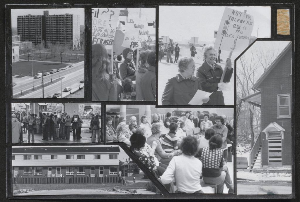 Collage de photographies prises lors d'un rassemblement près de la rue Saint-Rédempteur à Hull. On voit aussi quelques photographies d'habitations de la même rue. Il s'agit possiblement d'une manifestation contre les expropriations et le réaménagement de la ville de Hull.
