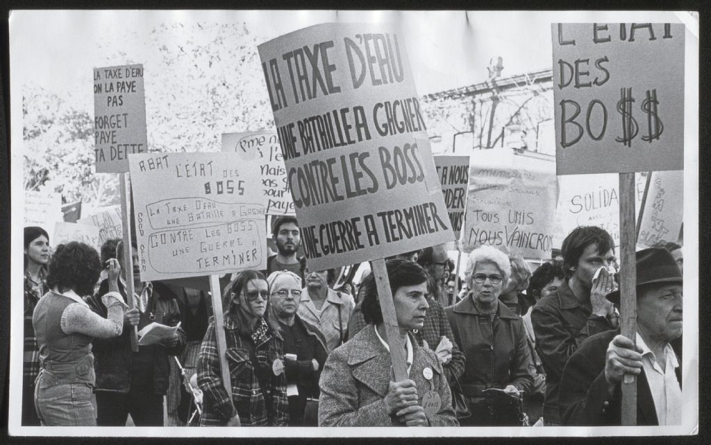 Manifestants contre la taxe d'eau, [1970-1977], Archives nationales à Gatineau, Fonds Roger Poirier, (07H,P134,S6,SS2,D1,P46), Photographe non identifié.