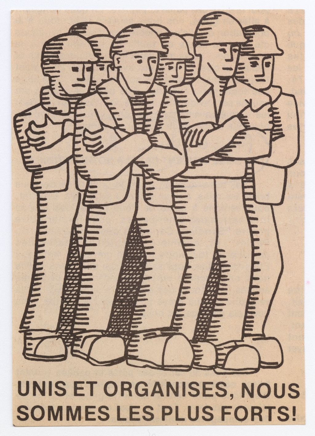 Caricature d'un groupe de travailleurs ayant les bras croisés. En dessous, il est écrit: "Unis et organisés, nous sommes les plus forts!".