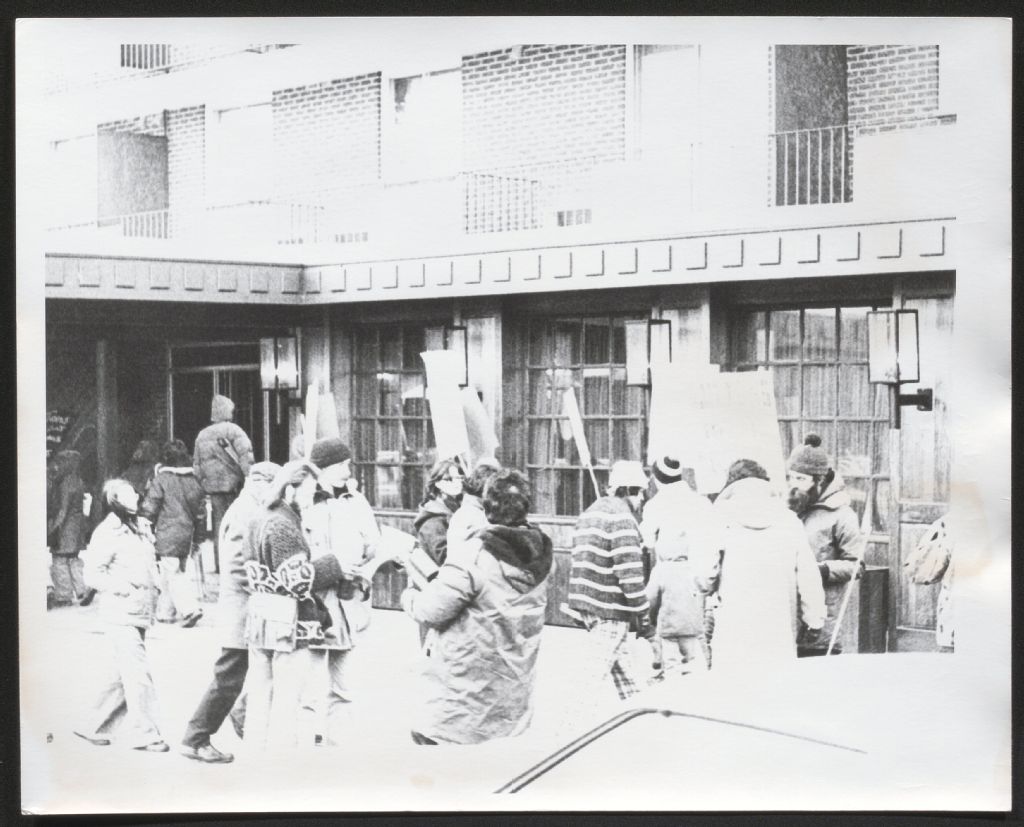 Manifestants regroupés, pancartes à la main, devant le bureau du ministre Lazure. À l'endos de la photo, une note indique: « Manifestation devant Lazure le 28 février 1977; Assistés-sociaux et SOS ».