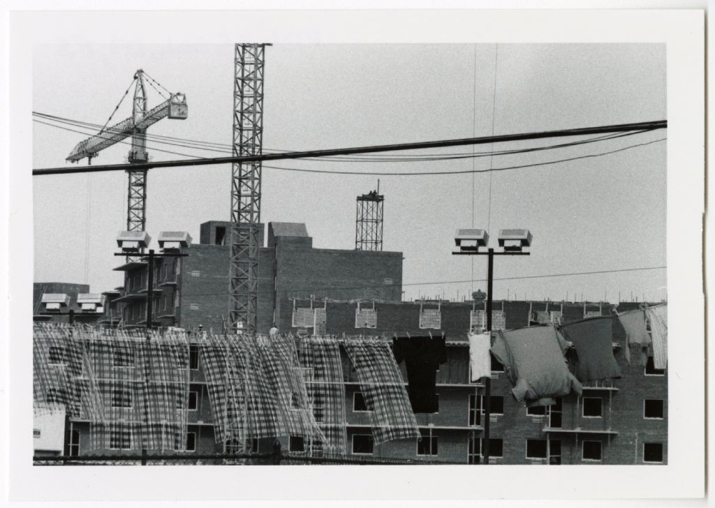 Immeubles à appartements en construction probablement situés rue Bédard à Hull avec au premier plan une corde à linge sur laquelle sèchent des vêtements.