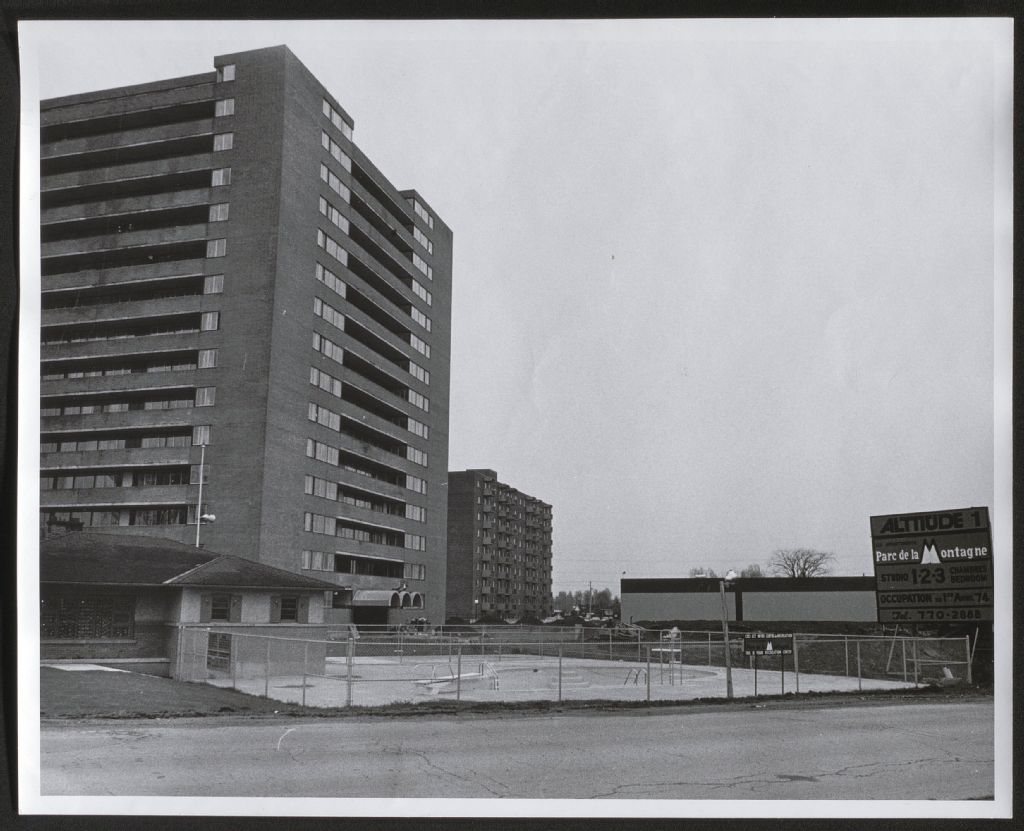 Immeuble à appartements Altitude et aréna Cholette à Hull, [1970-1980], Archives nationales à Gatineau, Fonds Roger Poirier, (07H,P134,S6,SS4,D7,P4), Photographe non identifié.