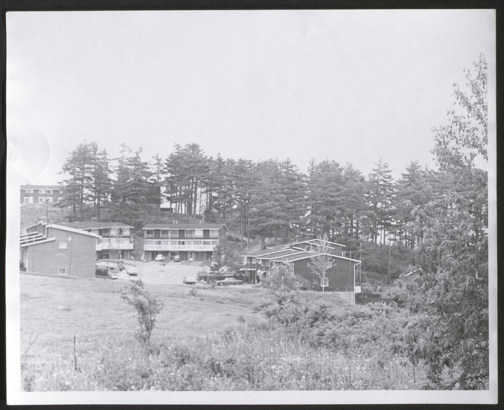 Résidences au pied du parc des Pins dans le quartier Mont-Bleu à Hull. À l'endos de la photographie, les initiales SB, sans doute pour Serge Blondin, photographe.