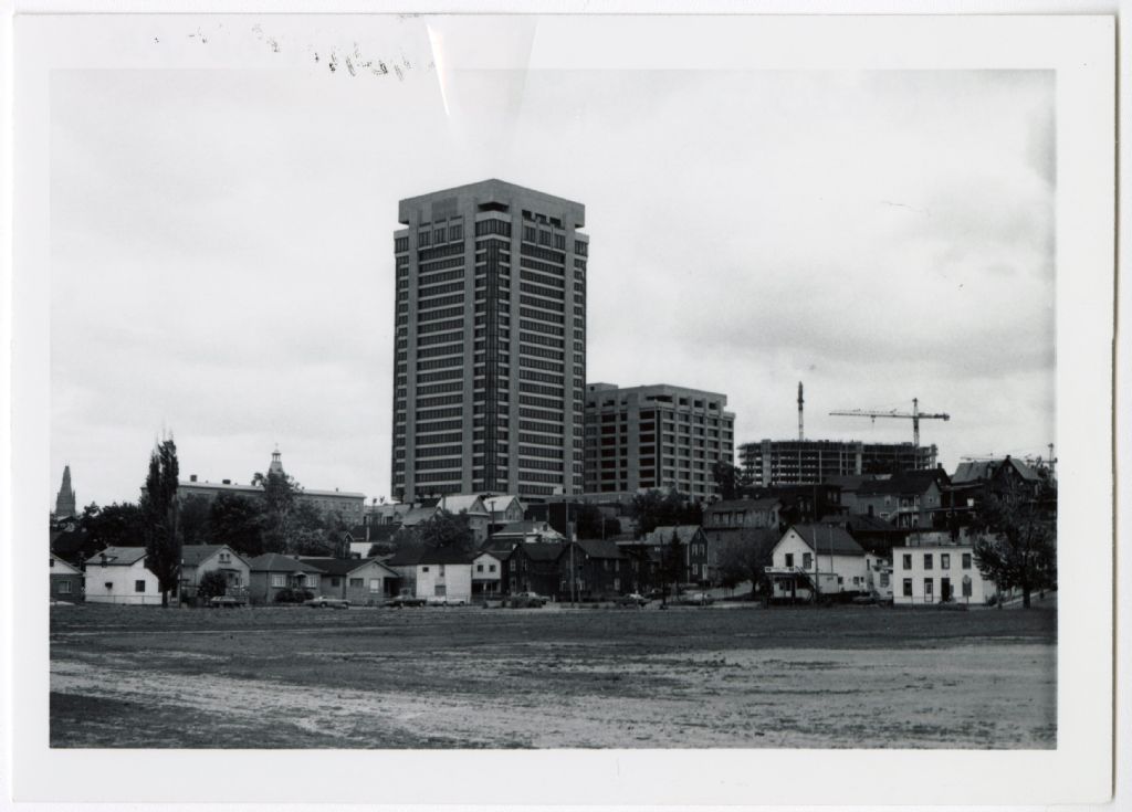 Complexe Place du Portage en construction à Hull. Photo prise à partir du parc Fontaine. À gauche, les maisons de la rue Kent. Du centre vers la droite, les maisons de la rue Papineau.