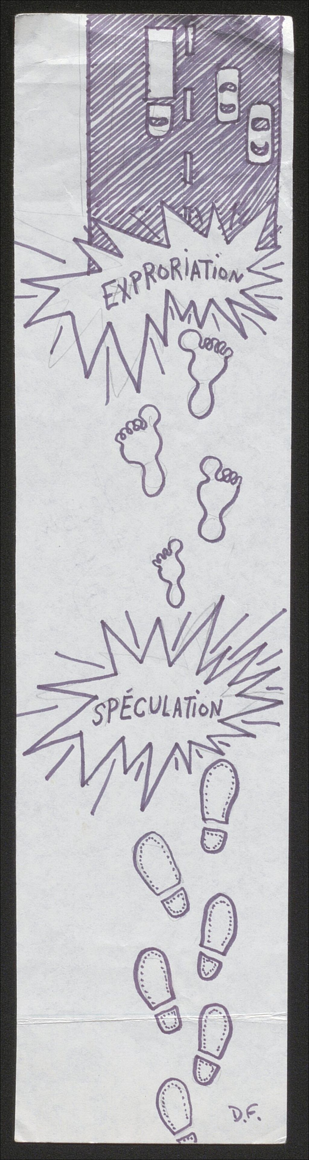 Dessin avec les mots expropriation et spéculation, [1970-1980], Archives nationales à Gatineau, Fonds Roger Poirier, (07H,P134,S6,SS6,D3,P17), Photographe non identifié.