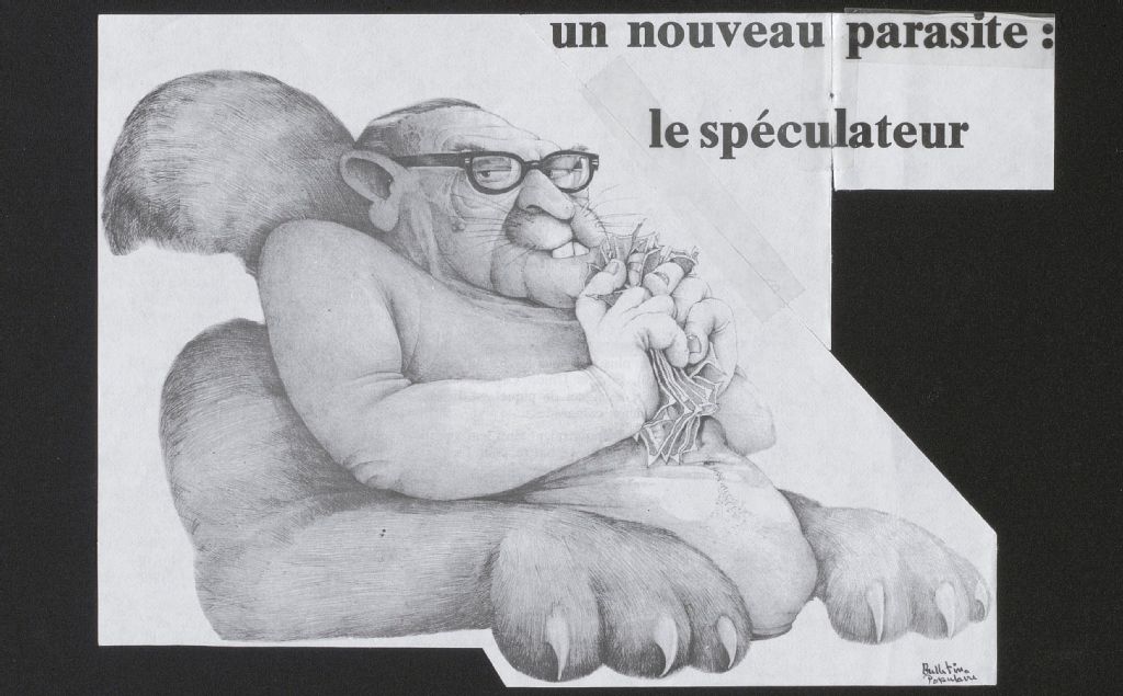 Caricature du spéculateur, [1970-1980], Archives nationales à Gatineau, Fonds Roger Poirier, (07H,P134,S6,SS6,D3,P19), Photographe non identifié.