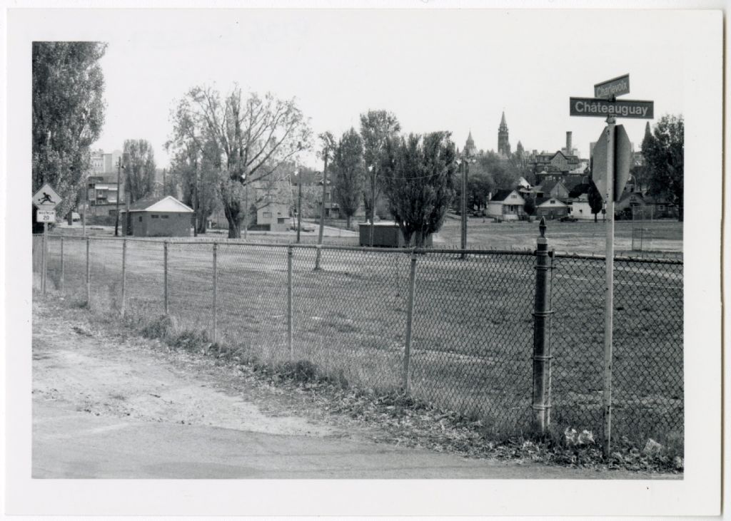 Parc Fontaine. Photo prise à partir de l'Intersection des rues Châteauguay et Charlevoix à Hull. On voit, dans le parc, deux chalets. À l'arrière-plan, l'édifice du Parlement du Canada à Ottawa.