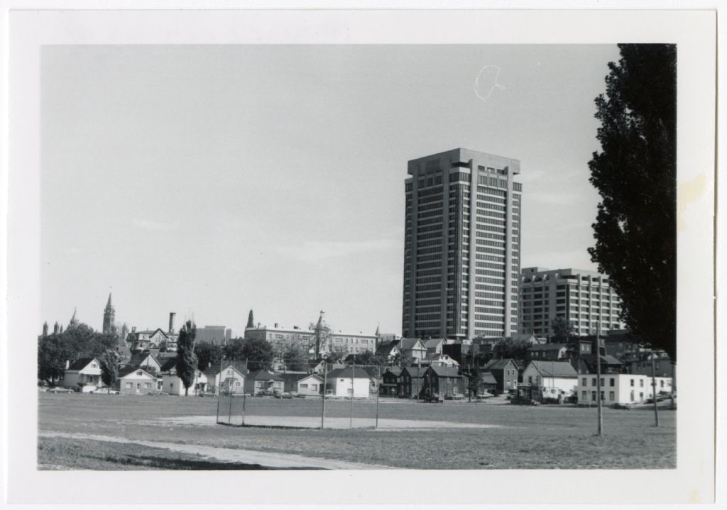 Vue rapprochée du parc Fontaine à Hull avec tours à bureaux du complexe Place du Portage en arrière-plan. Au premier-plan, l'arrêt-balle du parc. Au fond, à gauche, la tour de la Paix, au centre l'école Saint-Joseph.