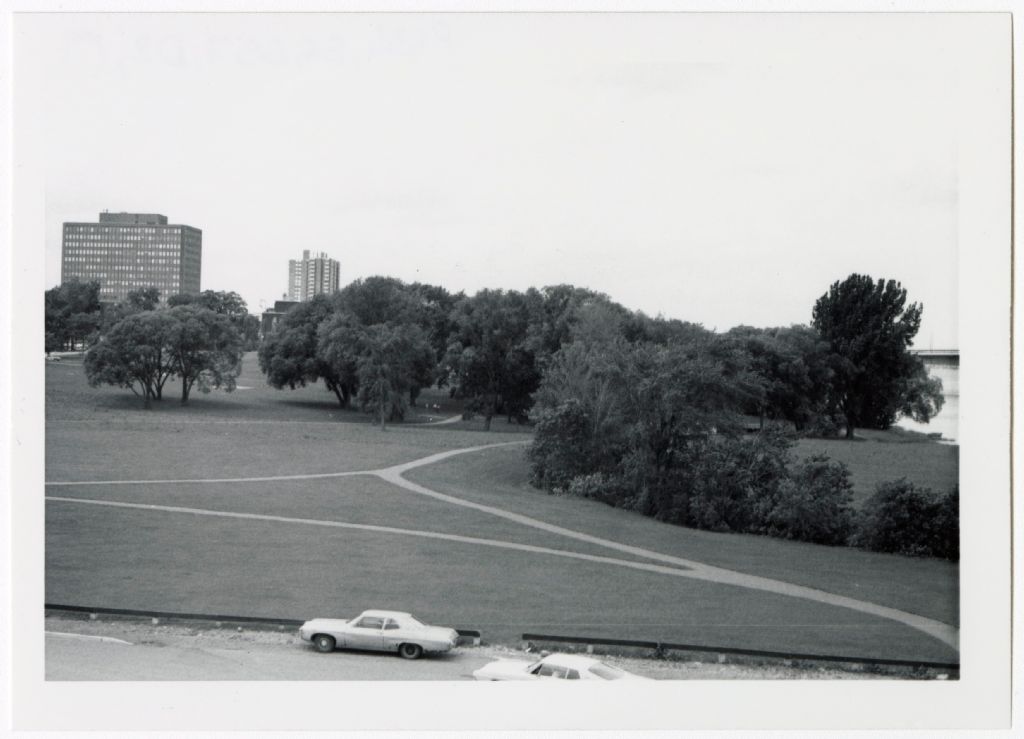 Parc Jacques-Cartier à Hull. À l'arrière-plan, à gauche, l'immeuble fédéral Fontaine et la tour Notre-Dame. À l'extrême droite, le pont Cartier-Macdonald.