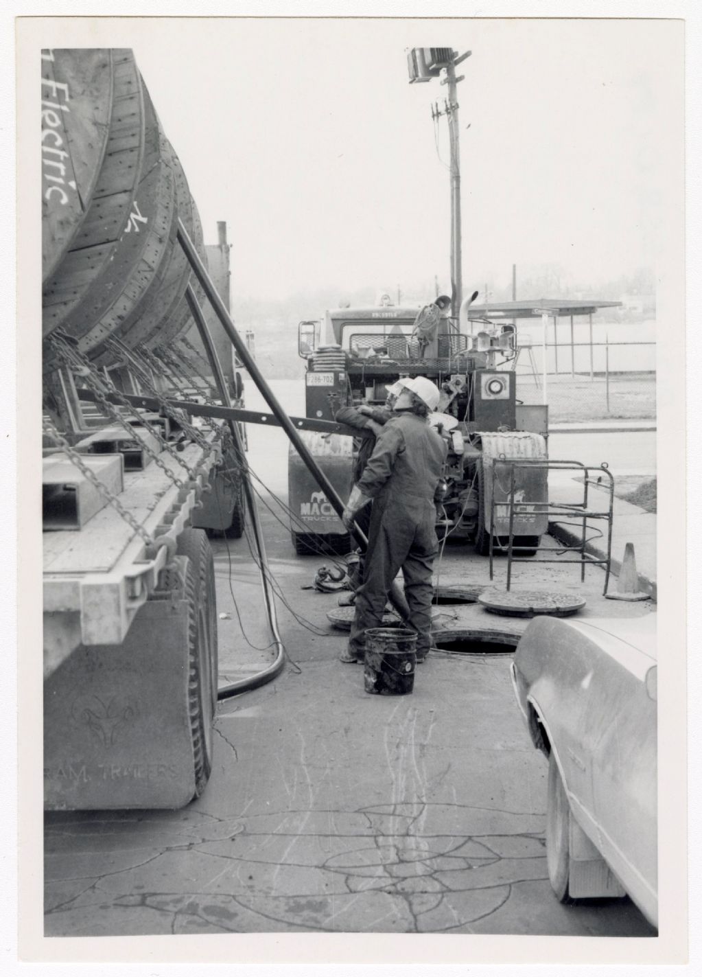 Travailleurs d'Hydro Québec qui installent un câble électrique, [1970-1980], Archives nationales à Gatineau, Fonds Roger Poirier, (07H,P134,S6,SS8,D1,P9), Photographe non identifié.