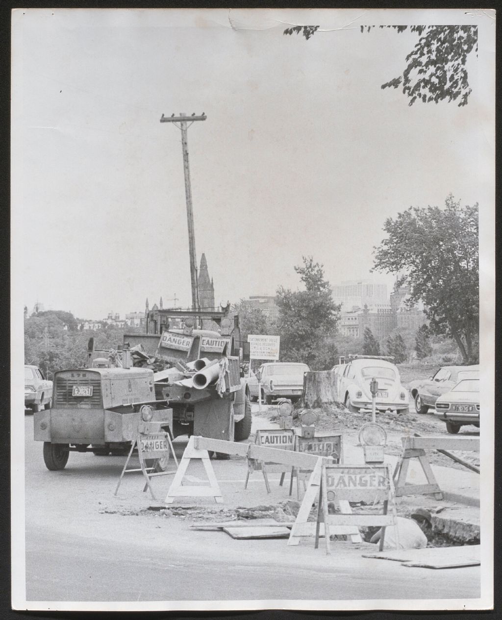 Travailleur de la voirie rue Hôtel-de-Ville, angle Notre-Dame à Hull. Un camion est chargé de tuyaux et de panneaux d'indication ; il remorque un groupe électrogène. En arrière-plan, la pointe Nepean, les clochers de la basilique Notre-Dame, la tour de l'édifice de l'Est, puis des immeubles à bureaux. À l'endos de la photo : « Assemblée générale de l'Île de Hull / 126, rue Saint-Laurent / Hull, P. Q. » et les initiales « S.B. ».