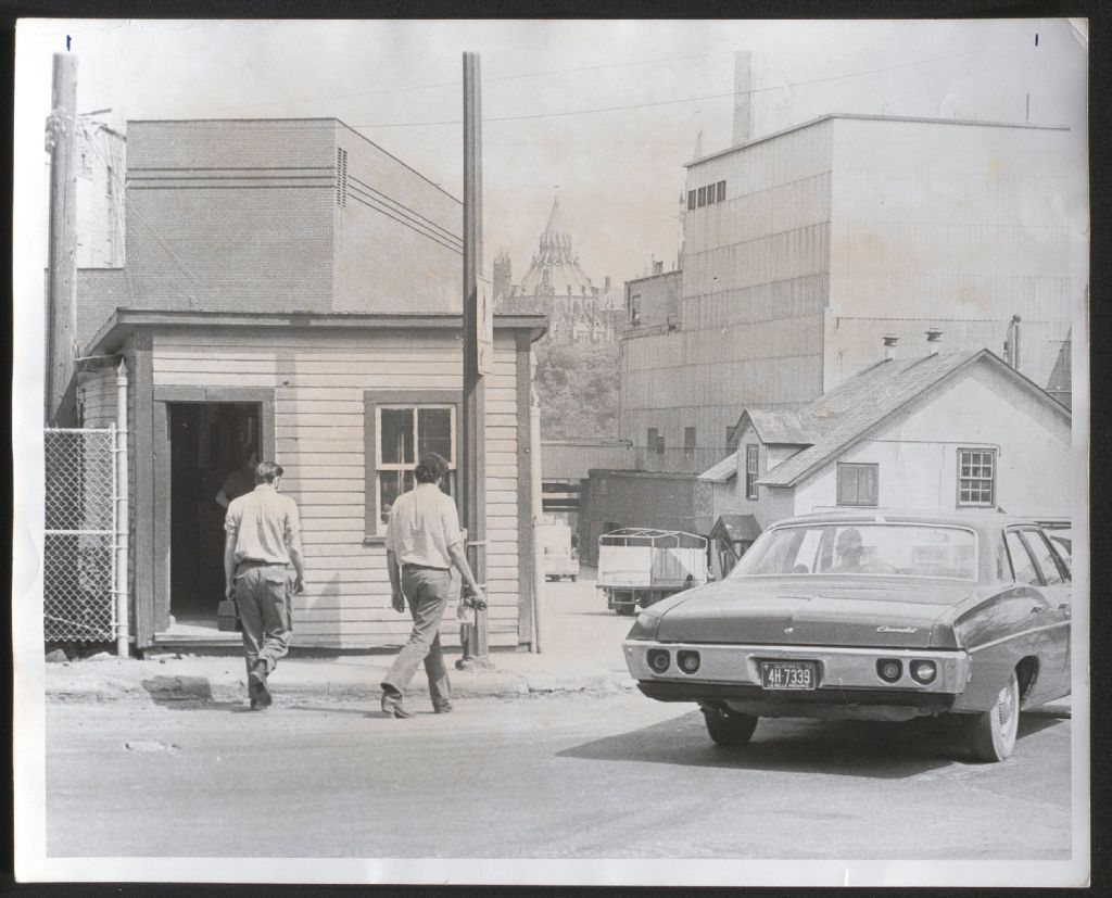 Usine avec deux camions stationnées et une voiture qui circule, [1970-1980], Archives nationales à Gatineau, Fonds Roger Poirier, (07H,P134,S6,SS8,D3,P25), Photographe non identifié.