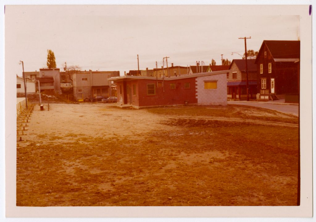 Parc Sainte-Bernadette vu du coin Saint-Rédempteur et Pilon à Hull. Le chalet servait d'endroit pour se réchauffer l'hiver et entreposer l'équipement d'entretien de la patinoire.