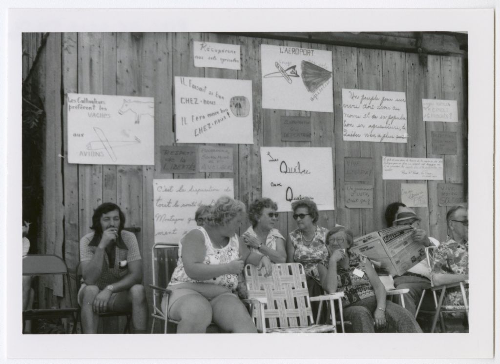 Manifestants rassemblés près d'un mur avec des messages divers, [1970-1980], Archives nationales à Gatineau, Fonds Roger Poirier, (07H,P134,S6,SS12,D1,P6), Photographe non identifié.
